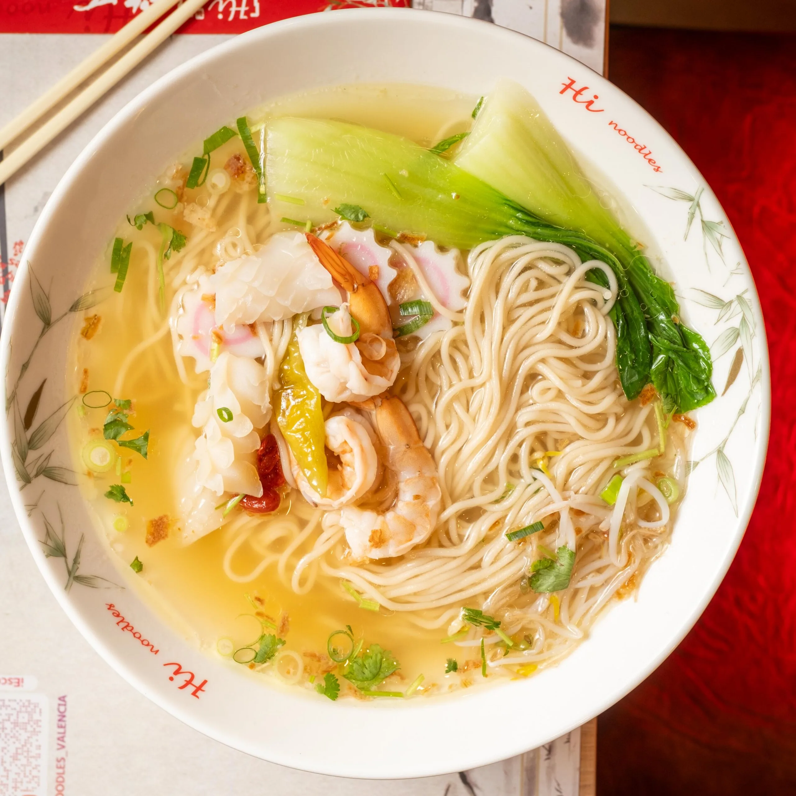 Sopa de noodles con mariscos en caldo dorado (+1€)
