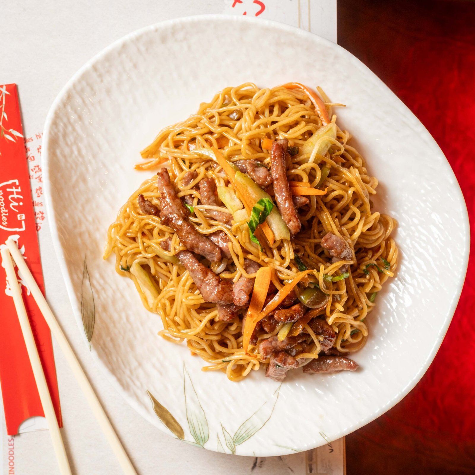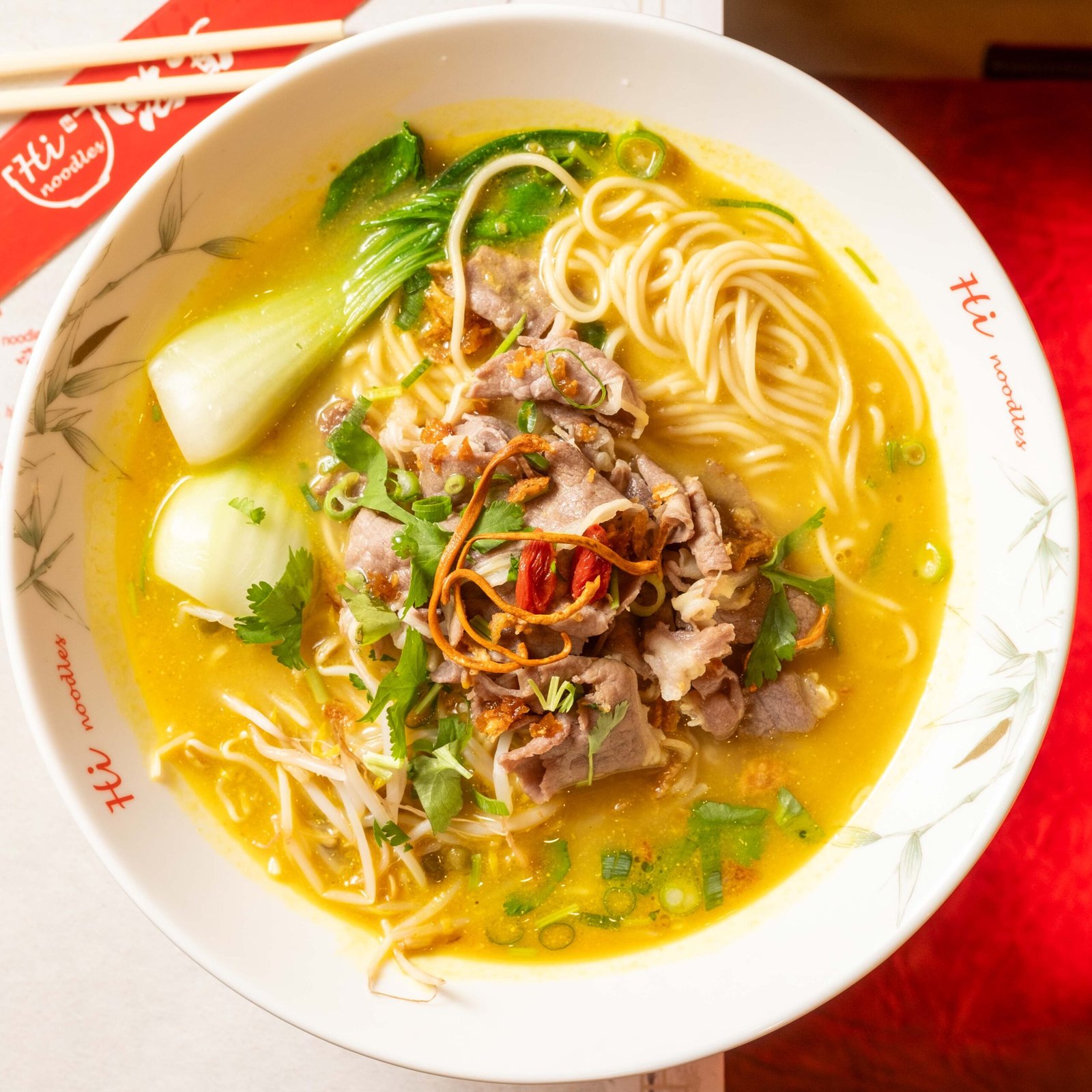 Sopa de noodles con ternera en caldo dorado