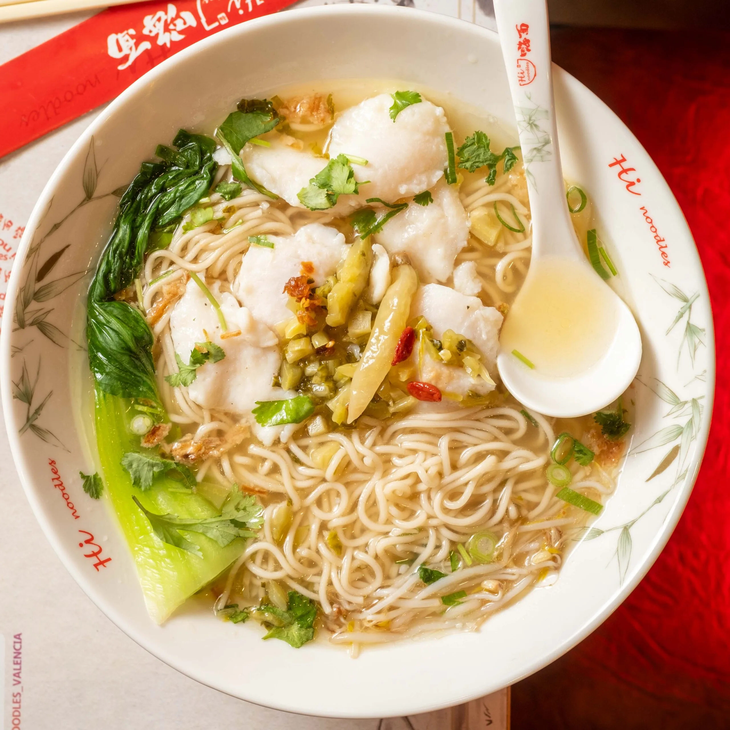 Sopa de noodles con pescado en caldo agrio (+1€)