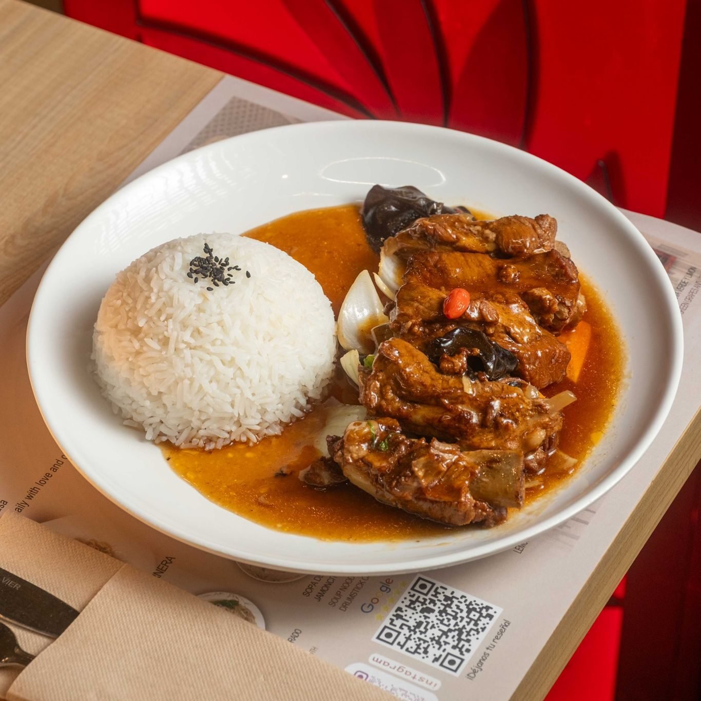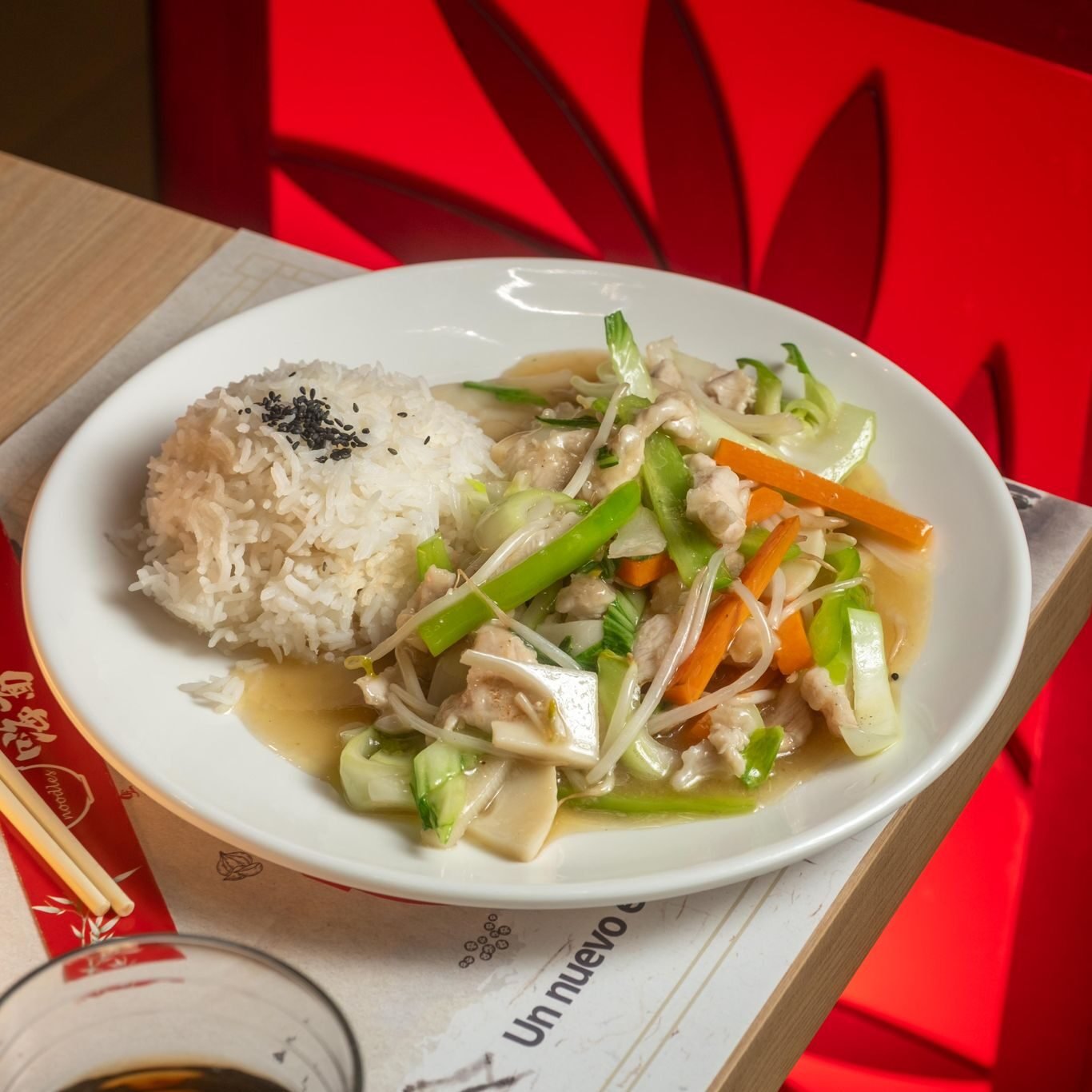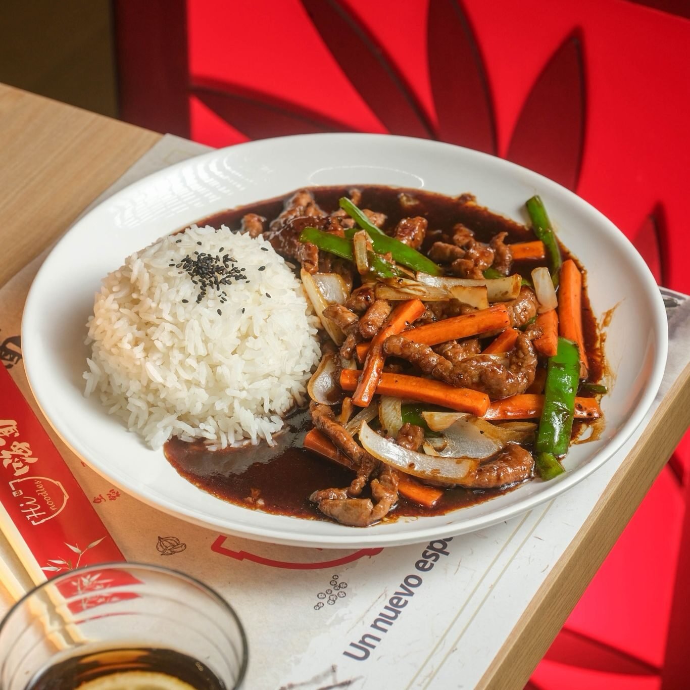 Arroz blanco con ternera salteada en salsa de pimienta negra