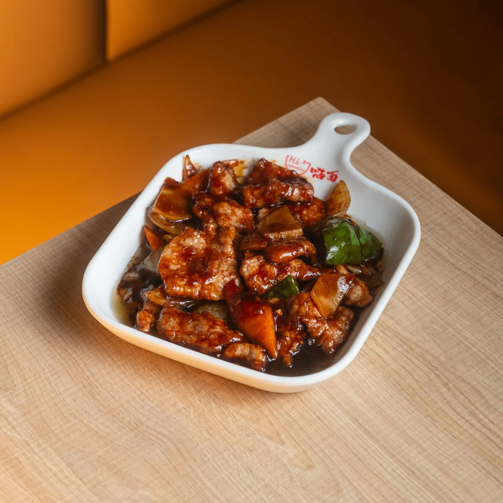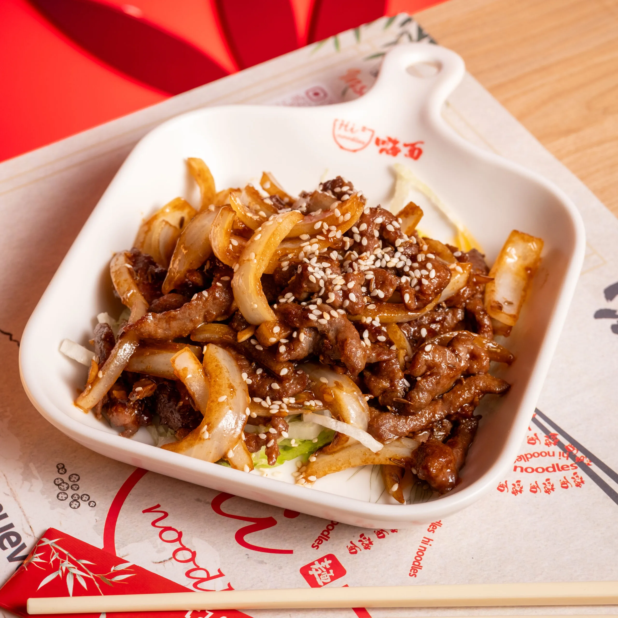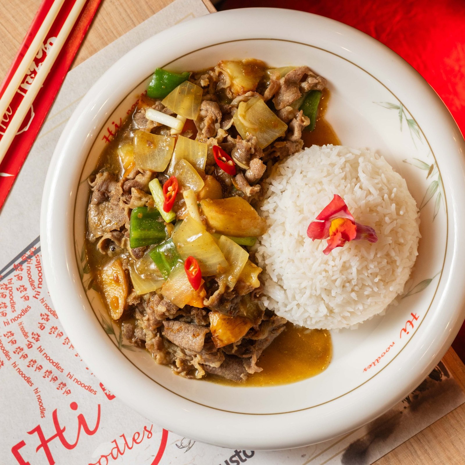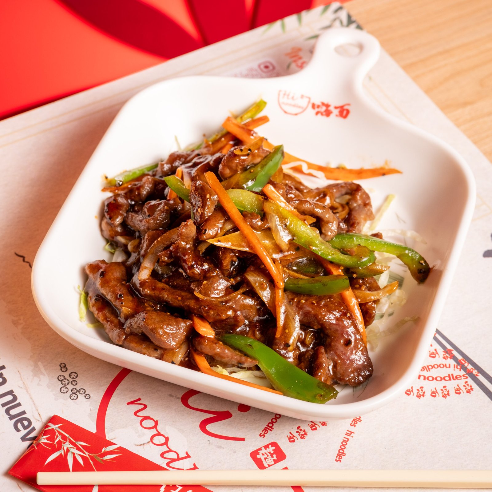 Arroz blanco con ternera salteada en salsa de pimienta negra