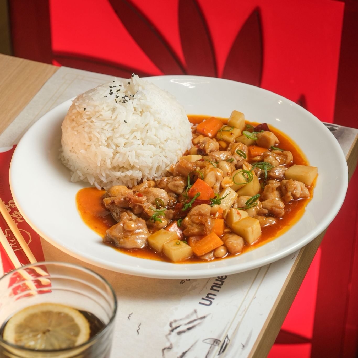 Arroz blanco con pollo estilo gong bao